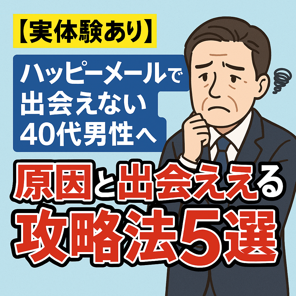 40代になって「マッチングアプリで出会えない…」と感じていませんか?特にハッピーメールを使っても思うように女性と出会えず、「結局サクラばかりなのでは?」と疑ってしまう人も多いでしょう。 しかし、実はハッピーメールでも正しい使い方を知れば、40... -